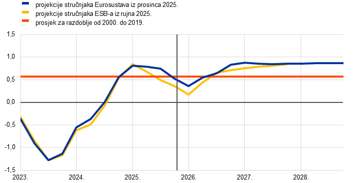 projekcije stručnjaka Eurosustava | prosinac 2025. | 1,4 | 1,2 | 1,4 | 1,4 | 2,1 | 1,9 | 1,8 | 2,0 | 2,4 | 2,2 | 1,9 | 2,0 | |