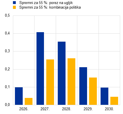 Osnovni scenarij ne uključuje utjecaj eventualnih daljnjih mjera EU‑a u sklopu paketa »Spremni za 55 %« zato što njihov utjecaj nije procijenjen ili je utvrđeno da je zanemariv. To je u skladu s Ekonomskom prognozom Europske komisije iz jeseni 2025., u kojoj se procjenjuje da će utjecaj na inflaciju mehanizma za ugljičnu prilagodbu na granicama u kratkoročnom razdoblju biti zanemariv.
