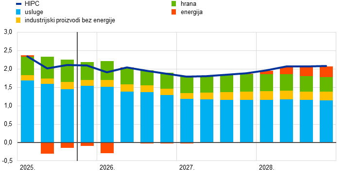 Predviđa se da će se inflacija smanjiti s 2,1 % u 2025. na 1,9 % u 2026. i 1,8 % u 2027. te potom u 2028. dosegnuti ESB‑ov srednjoročni cilj od 2,0 %. Očekivano smanjenje ukupne inflacije mjerene harmoniziranim indeksom potrošačkih cijena (HIPC) početkom 2026. posljedica je negativnog baznog učinka koji proizlazi iz cijena energije, a inflacija u skupinama bez energije trebala bi se nastaviti smanjivati tijekom cijele 2026. Pretpostavlja se da će doprinos inflacije cijena energije ukupnoj inflaciji ostati slab do pred kraj 2027. te se znatno povećati u 2028. zbog očekivane provedbe sustava EU‑a za trgovanje emisijama 2 (ETS2), čiji bi pozitivni utjecaj na ukupnu inflaciju iznosio 0,2 postotna boda. Predviđa se da će se inflacija mjerena HIPC‑om bez energije smanjiti s 2,5 % u 2025. na 2,2 % u 2026. te na 2,0 % u 2027. i 2028. Inflacija cijena hrane trebala bi se zamjetno smanjiti usporedno sa slabljenjem učinaka prethodnih povećanja cijena globalnih prehrambenih sirovina i nepovoljnih vremenskih uvjeta tijekom ljeta. Predviđa se da će se krajem 2026. stabilizirati na stopama malo višima od 2,0 %. Inflacija mjerena HIPC‑om bez energije i hrane trebala bi se smanjiti s 2,4 % u 2025. na 2,0 % u 2028. kako se inflacija cijena usluga bude smanjivala u uvjetima sve slabijih pritisaka troškova rada i kako se prošla aprecijacija eura bude prenosila kroz cjenovni lanac i ograničavala inflaciju cijena dobara. Rast plaća trebao bi se nastaviti smanjivati tijekom 2026. te se potom stabilizirati na razini od oko 3 % poduprt otpornim tržištem rada i rastom produktivnosti malo manjim od 1 %. Očekuje se da će rast jediničnih troškova rada oslabjeti iako će utjecaj na inflaciju biti djelomično neutraliziran postupnim oporavkom profitnih marži tijekom projekcijskog razdoblja. U odnosu na projekcije iz rujna 2025. izgledi za ukupnu inflaciju mjerenu HIPC‑om revidirani su naviše za 0,2 postotna boda za 2026. zbog iznenađujućih vrijednosti novih podataka o inflaciji mjerenoj HIPC‑om i rastu plaća, koji je doveo do znatne revizije naviše izgleda za plaće. Projekcija inflacije mjerene HIPC‑om za 2027. revidirana je neznatno naniže zbog pretpostavljenog manjeg doprinosa inflacije cijena energije jer se očekuje da će provedba sustava ETS2 biti odgođena i započeti u 2028. umjesto u 2027., premda bi taj doprinos trebala djelomično neutralizirati veća inflacija cijena usluga.