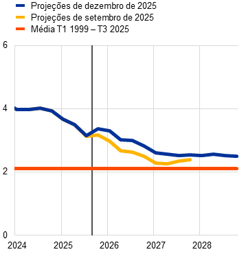 Projeções dos especialistas do Eurosistema | Dezembro de 2025 | 1,4 | 1,2 | 1,4 | 1,4 | 2,1 | 1,9 | 1,8 | 2,0 | 2,4 | 2,2 | 1,9 | 2,0 | |