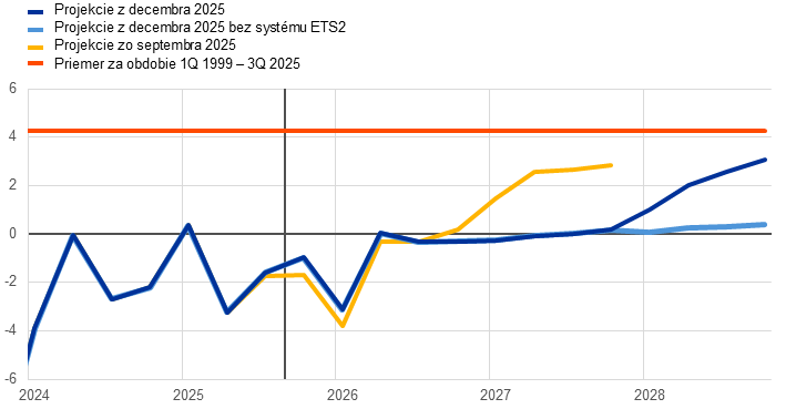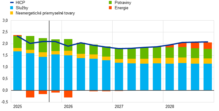 Predpokladá sa, že inflácia klesne z 2,1 % v roku 2025 na 1,9 % v roku 2026 a následne na 1,8 % v roku 2027, než v roku 2028 opäť stúpne na úroveň strednodobého cieľa ECB 2 %. Očakávaný pokles celkovej inflácie (meranej harmonizovaným indexom spotrebiteľských cien (Harmonised Index of Consumer Prices – HICP)) na začiatku roka 2026 je odrazom tlmiaceho bázického efektu vyplývajúceho z cien energií, zatiaľ čo inflácia neenergetických zložiek by sa mala počas roka 2026 naďalej zmierňovať. Očakáva sa, že príspevok inflácie cien energií k celkovej inflácii zostane až do konca roka 2027 tlmený, než sa v roku 2028 výrazne zvýši v dôsledku očakávanej implementácie systému EÚ na obchodovanie s emisiami 2 (Emissions Trading System 2 – ETS2), ktorý má spôsobiť nárast celkovej inflácie o 0,2 percentuálneho bodu. Inflácia HICP bez energií by sa mala podľa očakávaní znížiť z 2,5 % v roku 2025 na 2,2 % v roku 2026 a na 2,0 % v rokoch 2027 a 2028. Inflácia cien potravín by sa mala výrazne znížiť vzhľadom na ustupovanie vplyvu predchádzajúceho rastu cien svetových potravinových komodít a nepriaznivých poveternostných podmienok počas leta, pričom ku koncu roka 2026 sa má stabilizovať na úrovni mierne nad 2 %. Inflácia HICP bez energií a potravín (HICPX) by sa mala podľa projekcií znížiť z 2,4 % v roku 2025 na 2,0 % v roku 2028 v dôsledku poklesu inflácie cien služieb v prostredí zmierňovania tlakov nákladov práce a vzhľadom na premietanie predchádzajúceho zhodnocovania eura do cenového reťazca vedúce k oslabovaniu inflácie cien tovarov. Rast miezd by sa mal až do roku 2026 aj naďalej zmierňovať a napokon ustáliť na úrovni okolo 3 %, k čomu by mal prispieť odolný trh práce a rast produktivity tesne pod úrovňou 1 %. Rast jednotkových nákladov práce by sa mal zmierniť, hoci jeho vplyv na infláciu by mal byť čiastočne kompenzovaný postupným oživením ziskových marží počas sledovaného obdobia. V porovnaní s projekciami zo septembra 2025 bol výhľad celkovej inflácie HICP na rok 2026 upravený o 0,2 percentuálneho bodu nahor, odrážajúc nedávne prekvapivé údaje o inflácii HICP a raste miezd, ktoré v prípade rastu miezd viedli k výraznej revízii mzdového výhľadu smerom nahor. Projekcia inflácie HICP na rok 2027 bola upravená mierne nadol v dôsledku predpokladaného nižšieho príspevku inflácie cien energií, keďže sa očakáva, že zavedenie systému ETS2 sa odloží z roku 2027 na rok 2028, hoci tento príspevok by mal byť čiastočne neutralizovaný výraznejšou infláciou cien služieb.