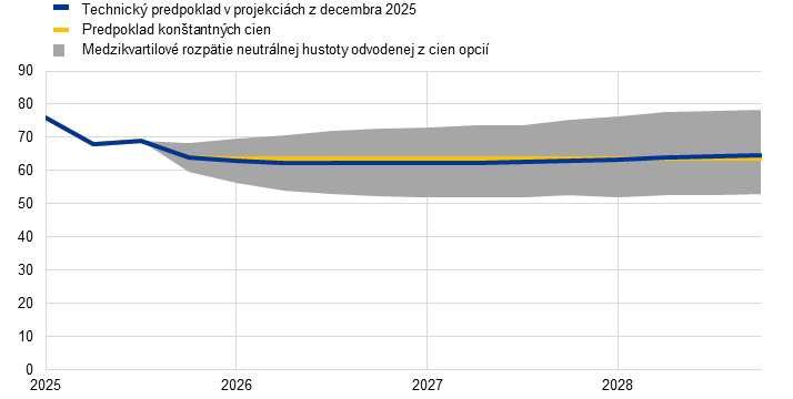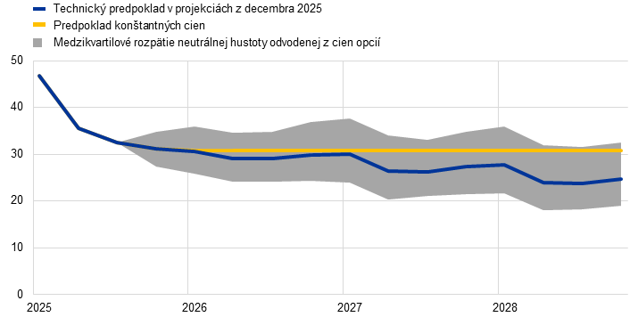 Poznámky: Revízie sú vyjadrené v percentách (v prípade úrovní), v percentuálnych bodoch (v prípade mier rastu) a v percentách za rok. Revízie mier rastu a úrokových mier sa počítajú na základe údajov zaokrúhlených na jedno desatinné miesto, zatiaľ čo revízie vykazované ako percentuálne zmeny sa počítajú na základe nezaokrúhlených údajov. Technické predpoklady týkajúce sa úrokových sadzieb a cien komodít v eurozóne vychádzajú z očakávaní trhu ku dňu uzávierky 26. novembra 2025. Ceny ropy sa vzťahujú na spotové ceny a ceny futures ropy Brent. Ceny plynu sa vzťahujú na spotové ceny a ceny futures na holandskej burze TTF. Ceny elektrickej energie predstavujú priemernú veľkoobchodnú spotovú cenu a cenu futures piatich najväčších krajín eurozóny. „Syntetická“ termínovaná cena kvót v rámci systému ETS1 na obchodovanie s emisiami (EUA) sa odvodzuje ako koncomesačná lineárne interpolovaná hodnota dvoch najbližších EUA futures Európskej energetickej burzy. Mesačné ceny EUA futures sa potom spriemerujú s cieľom získať ekvivalent ročnej frekvencie. Keďže s emisnými kvótami ETS2 sa významne neobchodovalo, odborníci Eurosystému stanovili cenové predpoklady v súlade s predpokladom Európskej komisie v jej hospodárskej prognóze z jesene 2025 (podrobnejšie informácie sú v boxe 2). Vývoj cien komodít vyplýva z trhov s futures počas desiatich pracovných dní končiacich sa dňom uzávierky. Predpokladá sa, že vzájomné výmenné kurzy zostanú počas sledovaného obdobia nezmenené na priemernej úrovni za desať pracovných dní končiacich sa dňom uzávierky. Predpoklady týkajúce sa nominálnych výnosov desaťročných štátnych dlhopisov v eurozóne vychádzajú z priemeru výnosov desaťročných dlhopisov jednotlivých krajín vážených ročnými hodnotami HDP. V prípade dostupnosti potrebných údajov sa nominálne výnosy desaťročných štátnych dlhopisov konkrétnych krajín definujú ako výnosy referenčných desaťročných dlhopisov zohľadňujúce forwardové nominálne výnosy odvodené v deň uzávierky z príslušných výnosových kriviek jednotlivých krajín. V prípade ostatných krajín sa výnosy desaťročných štátnych dlhopisov definujú ako výnosy referenčných desaťročných dlhopisov zohľadňujúce konštantný spread (pozorovaný v deň uzávierky) vo vzťahu k technickému predpokladu dlhodobej bezrizikovej úrokovej miery v eurozóne.
