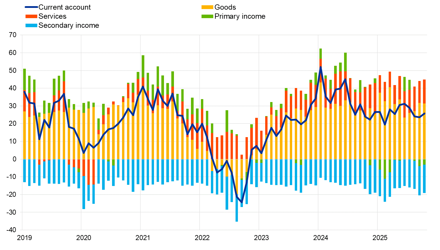 The current account of the euro area recorded a surplus of €26 billion in October 2025, an increase of €2 billion from the previous month (Chart 1 and Table 1). Surpluses were recorded for goods (€31 billion) and services (€13 billion). Deficits were recorded for secondary income (€16 billion) and primary income (€3 billion).