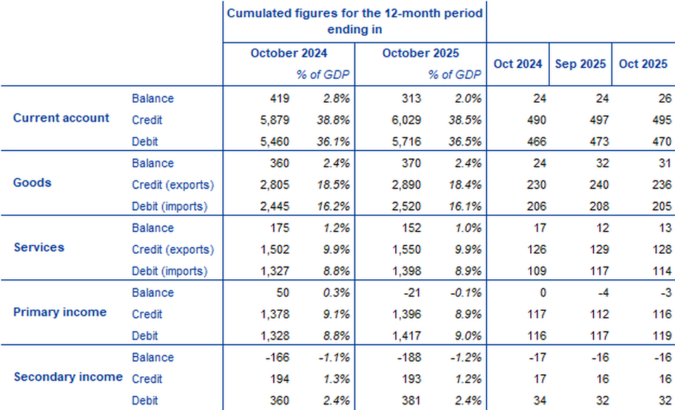 - Current account recorded €26 billion surplus in October 2025, up from €24 billion in previous month