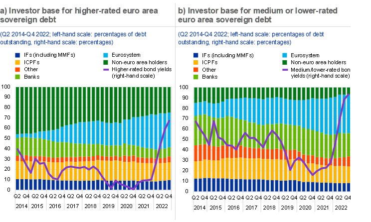 Notes: The charts show the breakdown of euro area government debt outstanding by euro area holding sector, while all non-euro area holders are aggregated in the dark green category because of missing information. Medium or lower-rated euro area sovereigns refer to countries with credit ratings below AA- over most of the sample period. IFs stands for investment funds; MMFs stands for money market funds; ICPFs stands for insurance corporations and pension funds. The purple lines depict the GDP-weighted ten-year government bond yields for higher-rated (panel a) and lower-rated (panel b) euro area sovereigns.