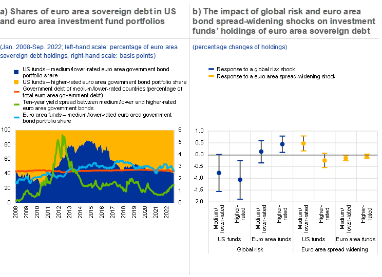 Notes: Panel a: the dark blue area (light-blue line) shows the share of medium or lower-rated euro area sovereign debt holdings in US (euro area) investment funds’ portfolios. The red line shows government debt outstanding of medium or lower-rated euro area countries relative to total euro area government debt. The green line shows the spread between GDP-weighted ten-year government bond yields for higher and medium or lower-rated euro area sovereigns. Panel b: the chart shows the impulse responses of euro area medium or lower-rated and higher-rated debt holdings to a global risk shock and a euro area spread-widening shock over a six-month horizon, calculated using local projections and data at a monthly frequency. The global risk (euro area spread-widening) shock is identified by upward spikes in the daily time series of the VIX (IT-DE CDS spread) that are larger than the 90th percentile. The dots show point estimates and the lines show one-standard deviation confidence intervals. The impulse responses are estimated while also controlling for the euro area monetary policy stance and economic news. Examples of global risk shocks picked up by the methodology include the Lehman Brothers default, the stock market “flash crash” of 2010, the US sovereign downgrade of 2011 and the onset of the coronavirus (COVID-19) pandemic. Examples of euro area spread-widening shocks picked up by the methodology include the euro area sovereign debt crisis, political uncertainty in May 2018 and the onset of the COVID-19 pandemic.