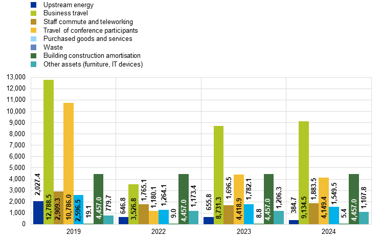 2024 marked the ECB’s second full year of operations without pandemic-related restrictions. From 2020 to 2022, these restrictions had a considerable impact, significantly reducing business travel and constraining the presence of ECB staff at its premises. Following the lifting of restrictions and the return to full-scale operations in 2023, the ECB’s carbon footprint increased once again – particularly as a result of the rise in business travel emissions. In 2024 business travel-related emissions saw a slight increase of 5%, while conference participants’ travel-related emissions decreased by 6% compared with the previous year. These two emission sources will remain key focus areas as the ECB works towards further reducing its climate impact (see Chapter 5.2 – Indirect emissions).