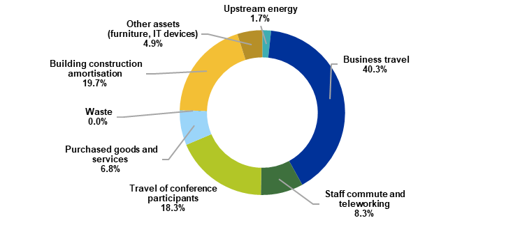 Total emissions saw a marginal decrease of 0.2% compared with 2023. While scope 1 emissions continued to decline in 2024 (-38%), mainly owing to a drop in emissions from cooling agent losses, scope 2 emissions increased by 13.2% as a result of increased heating and cooling consumption across all three buildings. Scope 3 emissions decreased in 2024 (-1.2%) and continue to be strongly influenced by business travel-related emissions and conference participants’ travel-related emissions.