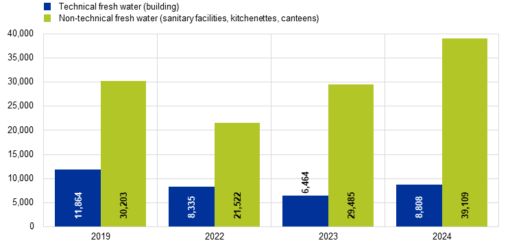 As outlined above, the ECB Environmental Statement 2025 presents environmental data on the three ECB premises covered by the EMS. These include the ECB-owned main building and the two rented facilities in Frankfurt’s city centre – the Eurotower and the Japan Center. The data for the main building are presented separately from the aggregated data for the city centre premises. All office space across these three buildings is fully occupied by the ECB.