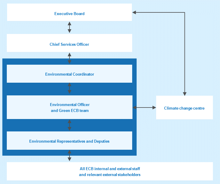 The Green ECB team oversees all elements of the EMS and coordinates related activities in collaboration with various stakeholders. The team is headed by an Environmental Coordinator and an Environmental Officer, both appointed by the ECB’s Executive Board and supported by environmental experts. To ensure the EMS is effectively implemented across the institution, Environmental Representatives are designated within each business area by their respective senior management. The Environmental Coordinator and Environmental Officer report to the Executive Board, via the Chief Services Officer, on EMS-related matters and performance.