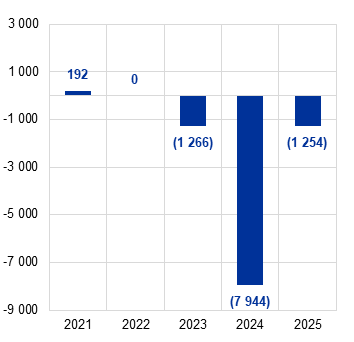 2025 m. ECB nuostolis sudarė 1 254 mln. eurų, palyginti su 1 744 mln. eurų nuostoliu 2024 m. Valdančiosios tarybos sprendimu, šis nuostolis bus rodomas ECB balanse ir dengiamas būsimųjų laikotarpių pelnu.