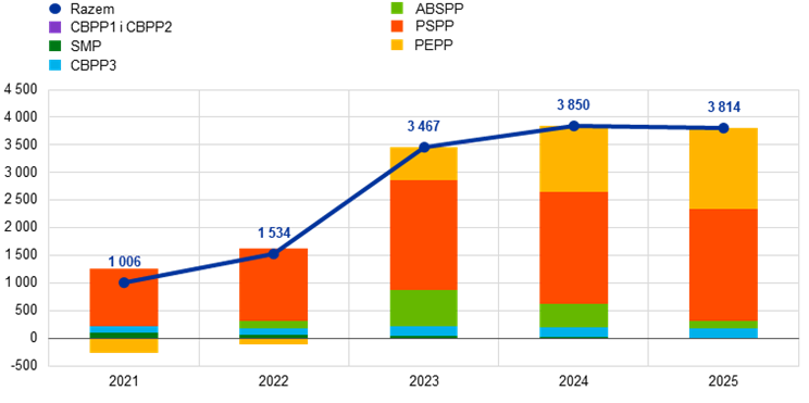 Do 2022 suma bilansowa EBC stale rosła (wykres 1), głównie z powodu bezwarunkowych zakupów papierów wartościowych prowadzonych przez EBC w ramach realizacji polityki pieniężnej Eurosystemu – poprzez program skupu aktywów (APP) i nadzwyczajny program zakupów w czasie pandemii (PEPP)[13]. Jej wzrost w 2022 był bardziej umiarkowany, ponieważ z końcem marca 2022 wygaszono zakupy netto papierów wartościowych w ramach programu PEPP, a 1 lipca 2022 – w ramach programu APP. W 2023 i 2024 suma bilansowa EBC zmalała, pod wpływem stopniowego zmniejszania portfela APP wynikającego z tego, że od marca do czerwca 2023 reinwestycje spłat kapitału z tytułu zapadających papierów wartościowych były jedynie częściowe, a od lipca 2023 całkowicie ich zaprzestano. Do obniżenia sumy bilansowej EBC w 2024 przyczyniło się także stopniowe zmniejszanie portfela PEPP, odzwierciedlające jedynie częściowe reinwestycje spłat kapitału w drugiej połowie roku. Tych reinwestycji zaprzestano z końcem 2024.