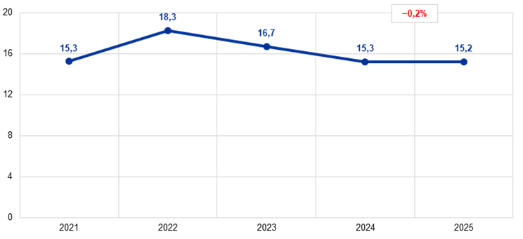 W 2025 równowartość w euro zasobu złota w posiadaniu EBC wzrosła o 18,9 mld EUR, do 59,8 mld EUR (wykres 4), co wynikało ze zwiększenia się ceny rynkowej złota wyrażonej w euro. Ten wzrost doprowadził także do zwiększenia się salda różnic z wyceny o taką samą kwotę (zob. punkt 1.3.2 „Kapitał własny netto”).