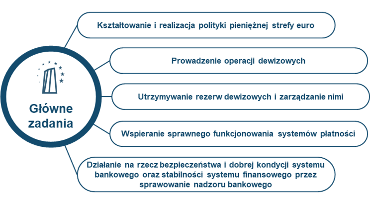 Europejski Bank Centralny wraz z bankami centralnymi państw członkowskich UE ze strefy euro tworzą Eurosystem[4]. Podstawowym celem Eurosystemu jest utrzymanie stabilności cen. Zadania EBC są określone w Traktacie o funkcjonowaniu Unii Europejskiej[5] oraz w Statucie Europejskiego Systemu Banków Centralnych i Europejskiego Banku Centralnego (Statut ESBC)[6] (rysunek 1). Działania EBC są ukierunkowane na wypełnianie jego mandatu, nie zaś – na osiąganie zysku.