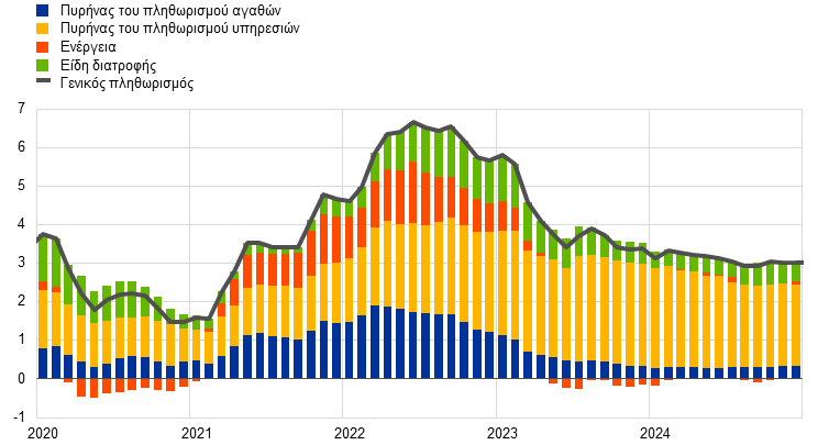 Σημειώσεις: Ο παγκόσμιος πληθωρισμός (δεν περιλαμβάνεται η ζώνη του ευρώ) υπολογίζεται με βάση τους εθνικούς ΔΤΚ και σταθμίσεις του ετήσιου ΑΕΠ σε όρους ισοτιμίας αγοραστικών δυνάμεων (ΙΑΔ). Το συνολικό μέγεθος που αναφέρεται στο διάγραμμα περιλαμβάνει 22 χώρες που καλύπτουν το 74% του παγκόσμιου ΑΕΠ (εκτός της ζώνης του ευρώ) σε ΙΑΔ. Η συμβολή των συνιστωσών στον γενικό πληθωρισμό υπολογίζεται με βάση μέσους συντελεστές στάθμισης για τις χώρες του ΟΟΣΑ. Ο πυρήνας του πληθωρισμού για τα αγαθά και ο πυρήνας του πληθωρισμού για τις υπηρεσίες δεν περιλαμβάνουν την ενέργεια και τα είδη διατροφής.