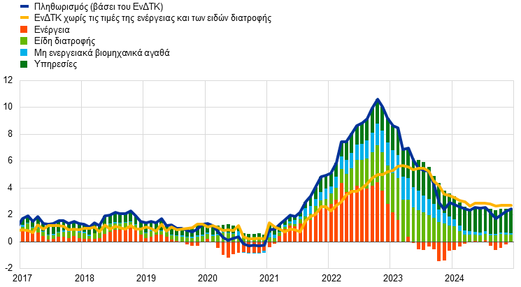 8. Για περισσότερες πληροφορίες σχετικά με τις εξελίξεις στον υποκείμενο πληθωρισμό, βλ. Lane, P.R., “Underlying inflation: an update”, ομιλία στο συνέδριο “Inflation: Drivers and Dynamics Conference 2024” που διοργανώθηκε από τη Federal Reserve Bank of Cleveland και την ΕΚΤ, Κλίβελαντ, 24.10.2024.