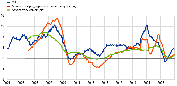 Το πραγματικό ΑΕΠ της ζώνης του ευρώ αυξήθηκε κατά 0,9% το 2024, έναντι 0,4% το 2023 (Διάγραμμα 1.3). Οι τριμηνιαίοι ρυθμοί ανάπτυξης έγιναν θετικοί στην αρχή του 2024 μετά από πέντε διαδοχικά τρίμηνα στασιμότητας, προτού επιβραδυνθούν και πάλι στο τέλος του έτους. Η ενίσχυση της ανάπτυξης αποδίδεται κυρίως στον τομέα των υπηρεσιών, ο οποίος συνέχισε να ωφελείται από τις διαρθρωτικές αλλαγές που παρατηρούνται μετά την πανδημία, όπως η ταχύτερη στροφή προς την οικονομία της γνώσης, η πράσινη μετάβαση και η μεταβολή των καταναλωτικών προτύπων. Η ανάκαμψη των πραγματικών εισοδημάτων, το παγκόσμιο εμπόριο και το πρόγραμμα Next Generation EU (NGEU) στήριξαν επίσης την οικονομική ανάπτυξη. Παράλληλα, ο βιομηχανικός τομέας παρέμεινε αδύναμος λόγω ενός συνδυασμού διαρθρωτικών και κυκλικών παραγόντων. Ο βιομηχανικός τομέας επηρεάστηκε περισσότερο συγκριτικά με τις υπηρεσίες από τις συνεχιζόμενες περιοριστικές συνθήκες του προηγούμενου κύκλου αυστηροποίησης της νομισματικής πολιτικής και από το υψηλό κόστος των εισροών. Ενώ τα περισσότερα οικονομετρικά υποδείγματα δείχνουν ότι η επίδραση της αυστηροποίησης στην οικονομική δραστηριότητα κορυφώθηκε στα τέλη του 2023 και στην αρχή του 2024, ο κύκλος χαλάρωσης της νομισματικής πολιτικής που ξεκίνησε στα μέσα του 2024 δεν είχε ακόμη μεταδοθεί στην οικονομία. Ο βιομηχανικός τομέας επηρεάστηκε επίσης δυσμενώς από την απώλεια εξαγωγικού μεριδίου της ζώνης του ευρώ, καθώς και από τις προκλήσεις κανονιστικής φύσεως και την αυξημένη αβεβαιότητα σε συνάφεια με πολιτικές και γεωπολιτικές εξελίξεις. Συνολικά, η ανάπτυξη το 2024 αντανακλούσε τη θετική συμβολή της ιδιωτικής και της δημόσιας κατανάλωσης, καθώς και των καθαρών εξαγωγών, ενώ οι επενδύσεις και οι μεταβολές των αποθεμάτων επηρέασαν αρνητικά την οικονομική δραστηριότητα.