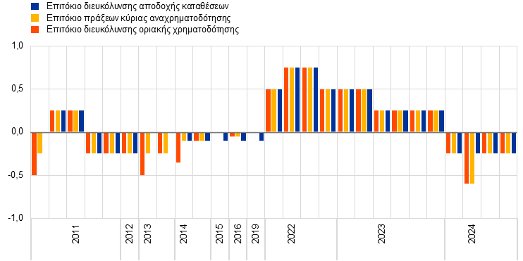Με τη μείωση των βασικών επιτοκίων της ΕΚΤ, το επιτόκιο της διευκόλυνσης αποδοχής καταθέσεων διαμορφώθηκε σε 3,00% και η σωρευτική μείωσή του στη διάρκεια του 2024 έφθασε τις 100 μονάδες βάσης.