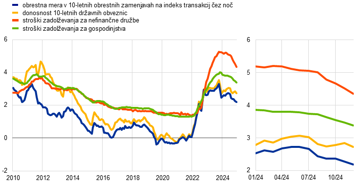Z znižanjem ključnih obrestnih mer ECB se je obrestna mera za odprto ponudbo mejnega depozita spustila na 3,00% in se v letu 2024 kumulativno znižala za 100 bazičnih točk. | Eurosistemova bilanca stanja se je zmanjšala za 0,5 bilijona EUR zaradi izteka tretje serije ciljno usmerjenih operacij dolgoročnejšega refinanciranja (CUODR III), znižanja portfelja v okviru programa nakupa vrednostnih papirjev (APP) ter v določeni meri zaradi prehoda na delno ponovno investiranje v okviru izrednega programa nakupa vrednostnih papirjev ob pandemiji (PEPP). Ti ukrepi so imeli ključno vlogo v obdobju nizke inflacije in med pandemijo. |