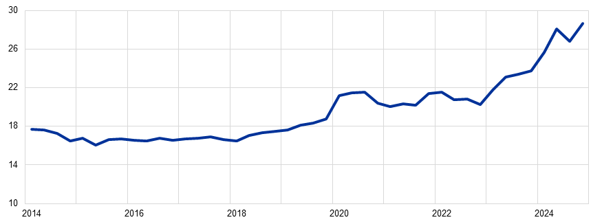 Količnik navadnega lastniškega temeljnega kapitala v bankah euroobmočja je ostal blizu rekordno visokih ravni in je v tretjem četrtletju 2024 znašal 15,7%. To je bil odraz visoke dobičkonosnosti bank in nizke ravni nedonosnih posojil. | Ob vse večjem številu udeležencev v sistemu poravnave takojšnjih plačil v TARGET (TIPS) se je število takojšnjih plačil v eurih povečalo z 963.894 na dan v decembru 2023 na 1.657.421 v decembru 2024, kar je 72-odstotni porast. |