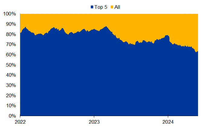 Reassuringly, the concentration of banks' exposure to hedge funds has gradually declined over time (Chart 3), although it remains elevated. Additionally, hedge funds account for only about 10% of outstanding repo volumes[5], and banks' exposures are diversified across approximately 200 hedge funds.
