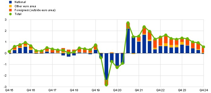 Notes: The residual contribution is mostly due to differences in employment growth between LFS and national accounts data. A small part is also due to approximations in calculating the contributions by nationality. The latest observation is for the fourth quarter of 2024.