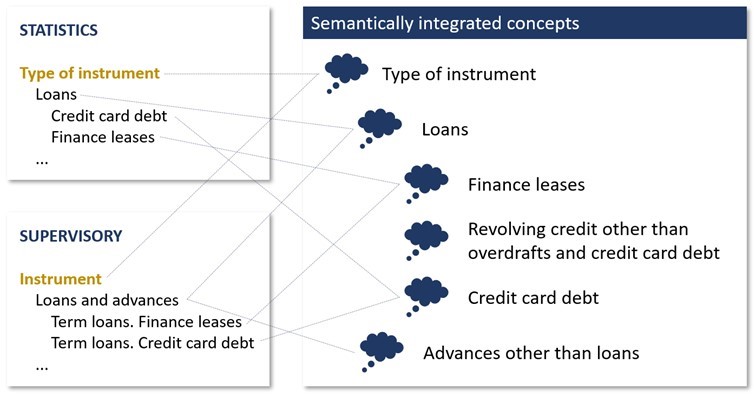 Semantic integration is the process of aligning different reporting frameworks. This is done by identifying and linking elements that represent the same concepts and by standardising the terms and definitions. In the example in Figure 3, the statistical concept “Type of instrument” matches the supervisory concept “Instrument”. With semantic integration, we establish a uniquely defined concept (“Type of instrument”) for both statistical and supervisory reporting. This concept is broken down into its constituent components, in the form of a hierarchy, with mapping across the two reporting frameworks. Having uniquely defined concepts significantly reduces the reporting burden.