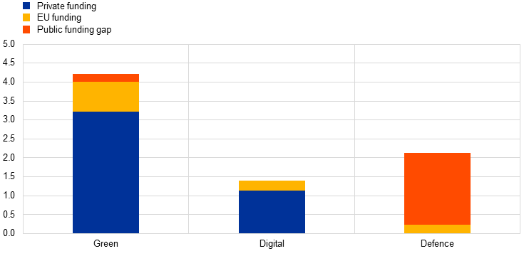 The additional public and private spending needs are estimated as the difference between (i) total strategic spending needs and (ii) historical strategic spending for the green, digital and defence transitions in the EU. For methodological details, see Bouabdallah, O., Dorrucci, E., Hoendervangers, L. and Nerlich, C. (2024), “Mind the gap: Europe’s strategic investment needs and how to support them”, The ECB Blog, ECB, 27 June; and Draghi, M. (2024), “The future of European Competitiveness”, European Commission, September.