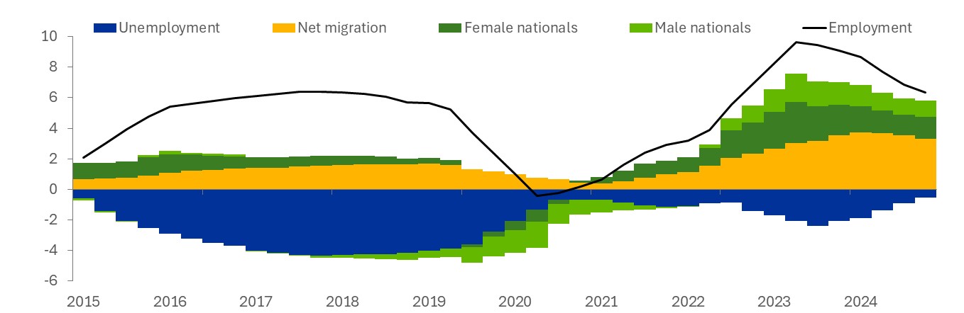 Notes: Four-quarter moving average of three-year changes in employment and its contribution from changes in migration, changes in the domestic labour force (female and male separately displayed) and changes in unemployment. Negative changes in unemployment indicate, on balance, positive contributions to employment.