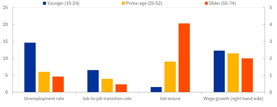 Notes: Unemployment rate (average 2022-25), job-to-job transition rate (average 2019-21); job tenure (average 2022-24); wage growth: average annual growth of hourly earnings (2014-22). For wage growth, the age categories as present in the SES are slightly deviate: young (less than 30), prime-age (30-49), older (50+).