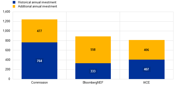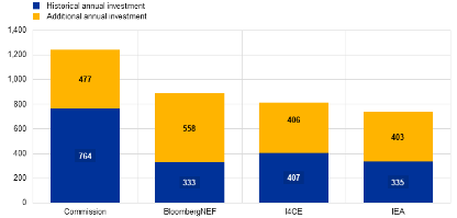 Section 2 | Focusing on the estimates of additional green investment needs − the amounts needed each year on top of continued investment of past amounts – these range between €558 billion according to BloombergNEF (BNEF) and around €400 billion according to the International Energy Agency (IEA) and the Institute for Climate Economics (I4CE) until 2030. | Focusing on the estimates of additional green investment needs − the amounts needed each year on top of continued investment of past amounts – these range between €558 billion according to BloombergNEF (BNEF) and around €400 billion according to the Institute for Climate Economics (I4CE) until 2030. |