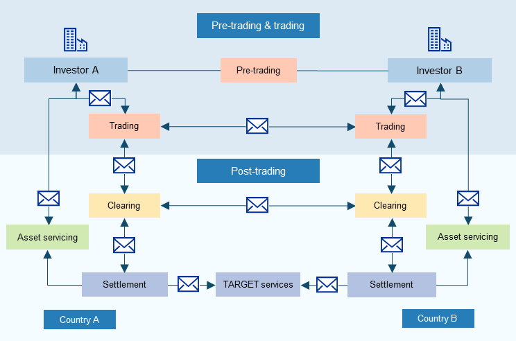 The European financial market relies on country-specific post-trade processes. Historically, markets in Europe operated independently from one another. For this reason, financial assets like bonds or shares are still mostly issued, held, traded and settled on a national basis. All the parties involved in handling these assets within a country communicate effectively throughout the process. However, when financial transactions occur between different countries, the exchange of information becomes complicated and inefficient. Entities have not yet transitioned to using unified approaches across the continent, and cross-border transactions often rely on less effective methods. Except for the TARGET services provided by the Eurosystem, most processes have not yet been fully integrated across Europe (Figure 1).