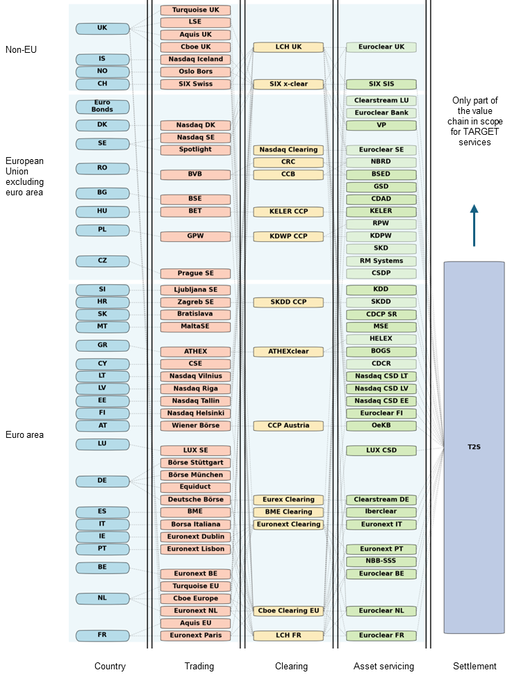 Central securities depositories (CSDs) and custodians are major parties in the national markets. In the post-trading space, they are crucial in two areas: (i) settling securities transactions where the details of the transaction are recorded electronically, ensuring that buyers receive their assets and sellers get paid and (ii) offering collateral management and asset servicing. TARGET services provide a strong European foundation for these parties, offering a streamlined pathway for securities settlement, which is crucial for an integrated value chain in the post-trade sector. However, many securities transactions are settled outside TARGET services, through internalised settlement flows, e.g. within custodians or CSD groups, which weakens this pathway. This mainly reflects the fragmentation in areas such as asset servicing. Additionally, not all CSDs have joined TARGET services or have established links with other CSDs across Europe.[8]