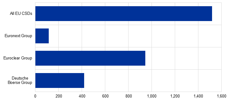 9. Settlement is concentrated in three groups of CSDs: Euroclear Group (Euroclear Bank, Euroclear Belgium, Euroclear Finland, Euroclear France, Euroclear Nederland and Euroclear Sweden), Deutsche Börse (Clearstream Banking SA, Clearstream Banking AG and LuxCSD) and Euronext Securities (Euronext Securities Copenhagen, Euronext Securities Milan, Euronext Securities Oslo and Euronext Securities Porto).