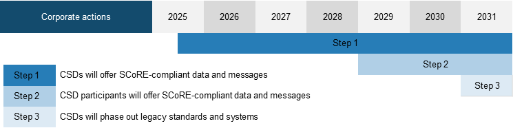 2. End 2028: CSD participants will be able to join. CSDs participants will be able to use harmonised interactions based on the common rulebook, which includes common data elements, business processes and workflows and ISO 20022 messaging standards. CSD participants also start offering the common messaging to their clients.