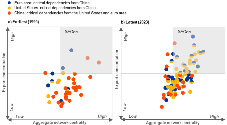 Notes: SPOFs stands for single point of failures. Each dot represents a critical dependency. For the euro area and the United States, the chart shows only dependencies from China, while for China it shows dependencies from both the euro area and United States. The euro area is treated as a single entity, abstracting from intra-euro area trade.