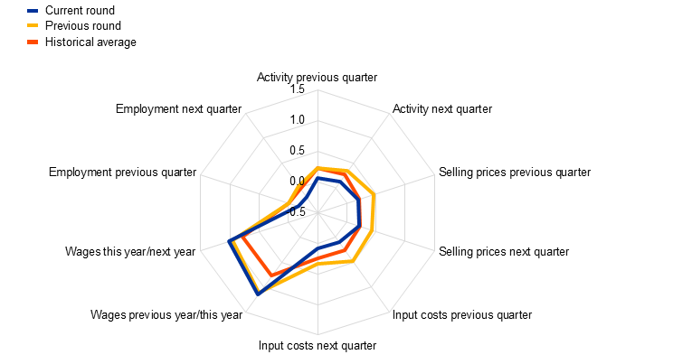 Notes: The scores reflect the average of scores given by ECB staff in their assessment of what contacts said about quarter-on-quarter developments in activity (sales, production and orders), input costs (material, energy, transport, etc.) and selling prices, and about year-on-year wage developments. Scores range from -2 (significant decrease) to +2 (significant increase). A score of 0 would mean no change. For the current round, previous quarter and next quarter refer to the second and third quarters of 2025 respectively, while for the previous round these refer to the first and second quarters of 2025. Discussions with contacts in January and in March/April regarding wage developments normally focus on the outlook for the current year compared with the previous year, while discussions in June/July and September/October focus on the outlook for the next year compared with the current year. The historical average is an average of scores compiled using summaries of past contacts extending back to 2008.