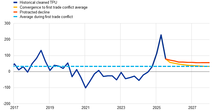 In conclusion, adjusting TPU measures can improve their indicator properties and make them easier to interpret. This box argues that text-based measures of trade policy uncertainty might capture a broader concept of uncertainty than uncertainty surrounding trade policy announcements and implementation alone. Once confounding influences and media cycle effects are removed, adjusted measures of trade policy uncertainty yield less sizeable macroeconomic impacts than commonly reported in the literature. In addition, if a more restrictive definition of trade policy uncertainty is adopted, these alternative indicators can readily be used to define scenarios for conditional forecasting and projection exercises. In this context, the adjusted TPU index was used as a starting point for analysing the impact of trade policy uncertainty in the Eurosystem/ECB staff macroeconomic projections for the euro area, and was employed both for baseline projections and scenario analysis.