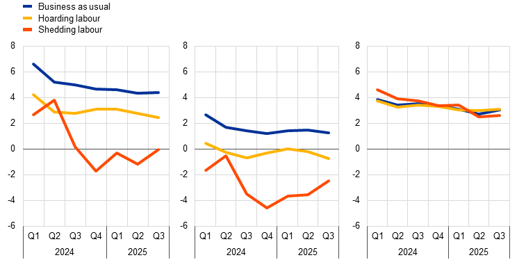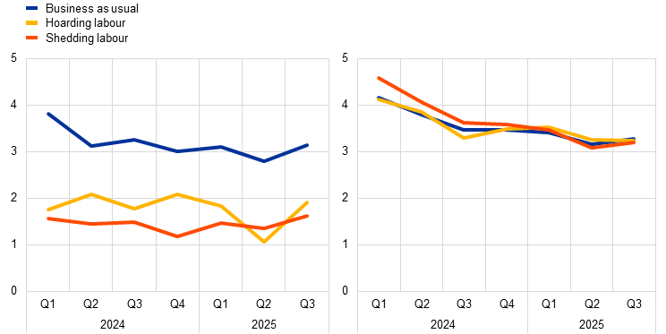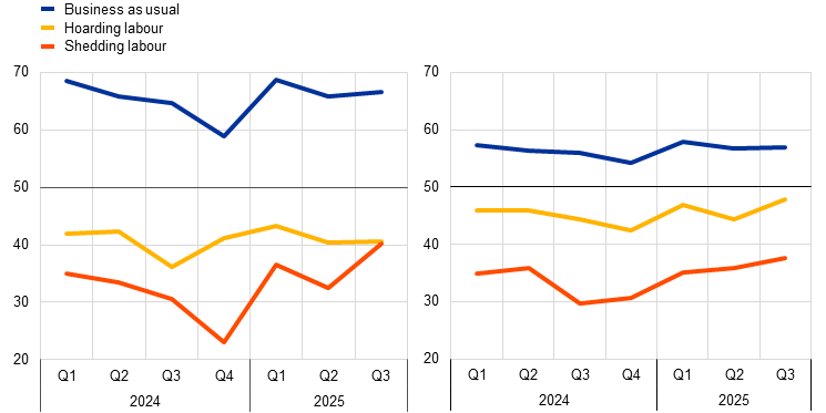 Notes: The “business as usual” category includes firms that have not reported a past deterioration in their specific business conditions; firms in the “hoarding labour” group have faced adverse shocks but have not reduced their workforce during the last quarter and firms in the “shedding labour” group have faced adverse shocks and have reduced their workforce. Firms’ expectations are for the next quarter. Levels above 50 signal an increase and levels below 50 indicate a decrease. The latest observations are for the third quarter of 2025.