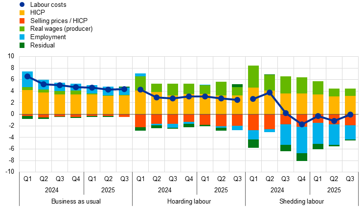 Firms reporting a deterioration in business activity tend to have lower expectations about future increases in their selling prices one year ahead (Chart D). Firms in the “business as usual” category expect their selling prices to continue to increase at a faster pace (by 3.1% year on year in the third quarter of 2025) than firms that have been negatively affected by shocks to their business activity in the past (1.9% for firms hoarding labour and 1.6% for firms not hoarding labour in the third quarter of 2025). These differences are not driven by firms’ expectations about the Harmonised Index of Consumer Prices (HICP), as all groups have similar HICP inflation expectations on average. This suggests that independently of the decision to hoard labour, firms affected by a deterioration in their business activity do not expect to be able to increase their prices by as much as their peers, hinting at weaker demand for their products or stronger competitive pressures. This weaker pricing power while facing similar wage growth could erode profit margins, forcing these firms to explore other channels to lower their labour costs.[4]