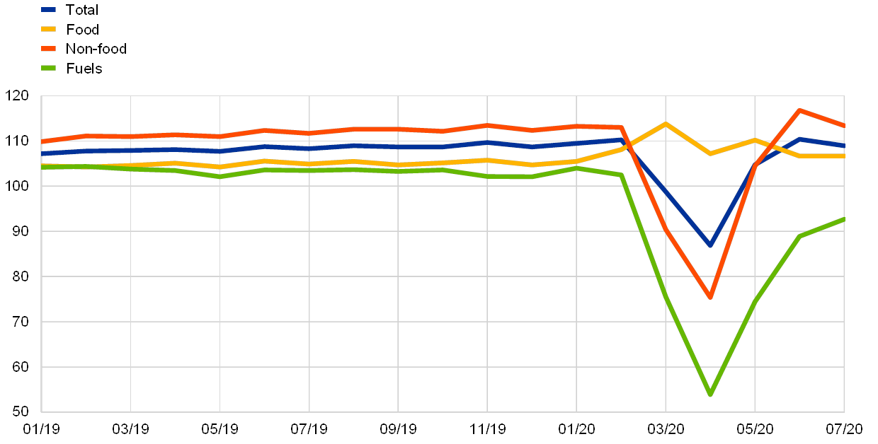 In Japan, economic activity is recovering in the third quarter but private consumption remains weak. Real GDP declined by 7.9% quarter on quarter in the second quarter, according to the second estimate, and is slightly revised downward compared to the first estimate (‑7.8% quarter on quarter). A nationwide state of emergency in April and May dampened activity, with double-digit contractions in private consumption of services and in exports accounting for the bulk of the decline in activity. The former reflects the impact of the domestic lockdown, while the latter reflects a slump in external demand. Recovery in foreign demand has contributed to a significant rebound in industrial production in July. But the pace of economic recovery remains subdued as indicated by the composite output PMI which, while increasing for the fourth consecutive month in August to 45.2, still remains in contractionary territory (i.e. below the 50 threshold). Private consumption of services remains weak. The consumption activity index published by the Bank of Japan indicates that consumption of durable and non-durable goods increased in June, pointing to pent-up demand playing an important role in the first full month after the lockdown, but it weakened again in July. Consumption of services, which accounts for 51% of household consumption, remained almost 20% below its first-quarter level in June. Although improved mobility trends for visits to restaurants, shopping centres and theme parks may suggest an ongoing recovery, consumption of services has remained broadly unchanged in July as compared with June. This, together with signals that the improvement in consumer sentiment stalled in August, points to a very gradual recovery in consumption, partly related to the resurgence of new COVID-19 infections during the months of July and August.