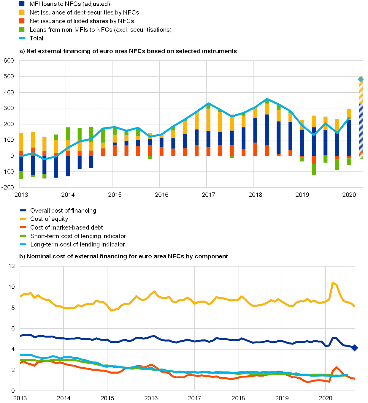 Notes: Panel (a) – Net external financing is the sum of MFI loans, net issuance of debt securities, net issuance of listed shares and non-MFI loans. MFI loans are adjusted for sales, securitisation and cash pooling activities. Loans from non-MFIs include loans from other financial institutions and insurance corporations and pension funds net of securitised loans. The striped bar and light blue diamond indicate the nowcast for the second quarter of 2020. Panel (b) – The overall cost of financing for NFCs is calculated as a weighted average of the costs of bank borrowing, market-based debt and equity, based on their respective amounts outstanding. The dark blue diamond indicates the nowcast of the overall cost of financing for September 2020 assuming that bank lending rates remain unchanged at their July 2020 levels. The latest observations for panel (a) are for the first quarter of 2020 for euro area accounts data; estimates for the second quarter of 2020 are based on ECB balance sheet items (BSI) and securities (SEC) data and Dealogic. The latest observations for panel (b) are for 9 September 2020 for the cost of market-based debt (monthly average of daily data), 4 September 2020 for the cost of equity (weekly data) and July 2020 for the cost of lending (monthly data).