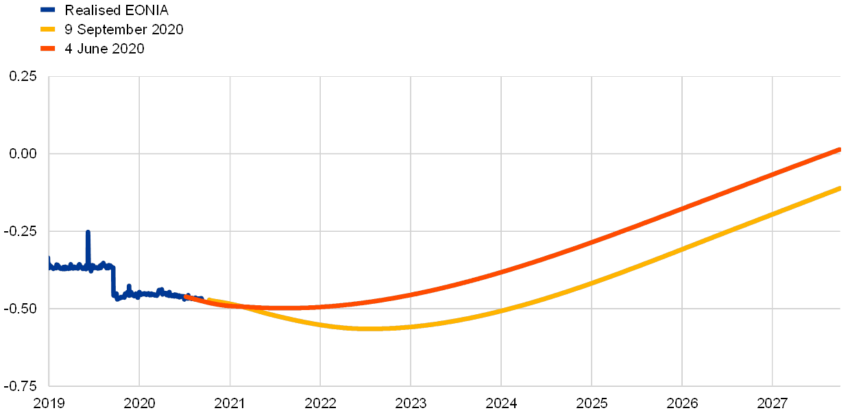 Over the review period (4 June 2020 to 9 September 2020) the forward curve of the euro overnight index average (EONIA) shifted downwards. Although mildly inverted at the short end, the curve does not signal firm expectations of a rate cut in the very near term. In a continuation of developments over the summer, long-term euro area sovereign bond spreads decreased over the review period amid a combination of monetary and fiscal support. Prices of risk assets increased somewhat, mainly against the backdrop of a generally more positive short-term earnings outlook. In foreign exchange markets, the euro appreciated strongly in trade-weighted terms.
