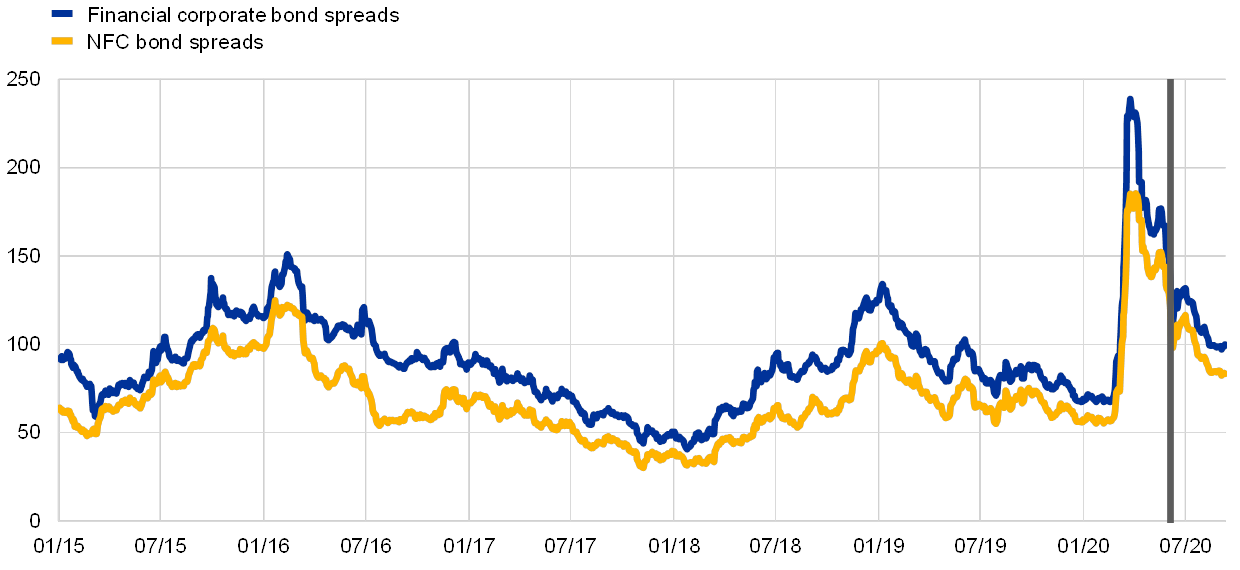 Euro area corporate bond spreads continued to narrow (see Chart 8). Spreads on investment-grade NFC bonds and financial sector bonds (relative to the risk-free rate) decreased by 38 and 37 basis points respectively. Overall, the decrease largely reflects a decline in the excess bond premium, i.e. the component of corporate bond spreads that is not explained by credit fundamentals (as measured by ratings and expected default frequencies), which have remained largely stable. Despite the significant compression since March, corporate bond spreads remain somewhat above levels prior to the coronavirus (COVID-19) pandemic, which may reflect market expectations of a rise in corporate defaults over the next few quarters.