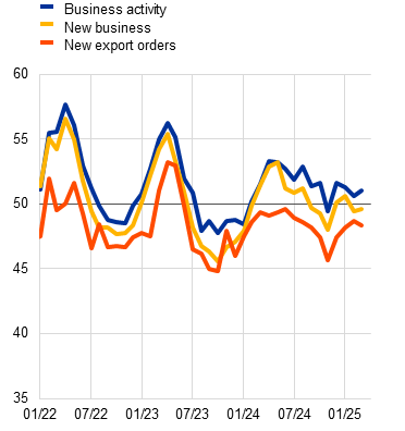 Euro area activity is expected to have continued to grow moderately in the first quarter of 2025 (Chart 3). According to Eurostat, euro area real GDP increased by 0.2%, quarter on quarter, in the fourth quarter of 2024. Activity is expected to have continued to exhibit moderate growth in the first quarter of 2025, as suggested by available survey data, which remained largely unaffected by the uncertainty surrounding US trade policy in the first few months of the year. The composite output Purchasing Managers’ Index (PMI), released on 3 April 2025, rose above the growth threshold of 50 in the first quarter of 2025, pointing to a modest expansion in activity. At the same time, the European Commission’s Economic Sentiment Indicator (ESI), released on 28 March 2025, also exceeded its average for the previous quarter. However, it declined in March, following two months of increases. This decline was broad-based across sectors, except for industry, where confidence rose. Survey data also indicate some rebalancing of previous sectoral differences in early 2025, as manufacturing activity showed signs of improvement, while services activity continued to grow at a moderate pace (Chart 4). The PMI manufacturing output index rose above the growth threshold of 50 for the first time in two years in March. The outcome brings the average for the first quarter to 48.8, which still points to persisting weakness but also to a substantial improvement on the previous quarter (average of 45.1). According to the ESI, confidence in the manufacturing sector also showed signs of improvement in the first quarter of 2025. At the same time, services sector activity, which has been leading the slow euro area recovery in recent quarters, continued to increase at a steady pace early in the year. The PMI services output index stood at 51 on average in the first quarter, broadly unchanged from the previous quarter and maintaining modest growth. However, economic sentiment for services deteriorated in March.