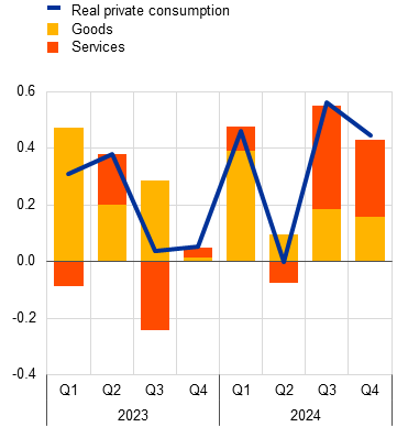Private consumption continued to grow robustly in the fourth quarter of 2024 and is likely to have moderated at the beginning of 2025. Private consumption expanded by 0.4%, quarter on quarter, in the fourth quarter of 2024 (Chart 6, panel a). Goods consumption increased by 0.8%, at a faster pace than services consumption, which rose by 0.4%. Meanwhile, the saving rate stabilised at 15.3% in the fourth quarter, partly reflecting elevated consumer uncertainty and subdued confidence. The volume of retail sales increased by 0.1% in the first two months of 2025 relative to the fourth quarter of 2024, while services consumption expanded by 0.4% in January compared with the same period. Incoming data continue to point to ongoing, albeit more moderate, household spending growth at the beginning of 2025. The European Commission’s consumer confidence indicator edged down in March (Chart 6, panel b). This softening in consumption sentiment occurred alongside a noticeable decline in business expectations for contact-intensive services, indicating a potential moderation in demand for services. By contrast, the ECB’s latest Consumer Expectations Survey finds that planned spending on holidays for the next 12 months remains robust. At the same time, consumer expectations for major purchases over the next 12 months improved further in March but, on average, were broadly unchanged in the first quarter of 2025 compared with the previous quarter. Looking ahead, persisting economic policy uncertainty, particularly in the context of global economic developments, should continue to weigh on households’ spending decisions. However, higher purchasing power – reflecting the slowdown in inflation – and further rises in real labour income are expected to continue to support consumption in the quarters ahead.