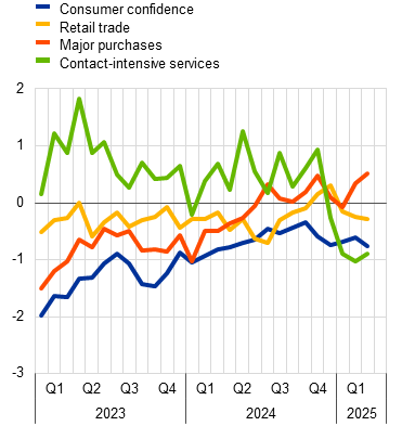 Notes: In panel a), real private consumption refers to the national concept and the components refer to the domestic concept of consumption. The latest observations are for the fourth quarter of 2024. In panel b), business expectations for demand in contact-intensive services and retail trade expectations refer to the next three months, while consumer expectations for major purchases refer to the next 12 months. The contact-intensive services series is standardised for the period January 2005-19, owing to data availability, whereas the other three series shown in the chart are standardised for the period 1999-2019. “Contact-intensive services” include accommodation, travel and food services. The latest observations are for March 2025.