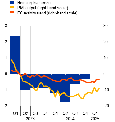 Notes: The lines indicate monthly developments, while the bars refer to quarterly data. The PMIs are expressed in terms of the deviation from 50. In panel a), business investment refers to non-construction investment excluding Irish intangibles. Monthly data reflect the capital goods sector. The latest observations are for the fourth quarter of 2024 for business investment and for March 2025 for the PMIs and the European Commission’s confidence indicator. In panel b), the line for the European Commission’s activity trend indicator refers to the building and specialised construction sector’s assessment of the trend in activity over the preceding three months. The latest observations are for the fourth quarter of 2024 for housing investment and for March 2025 for the PMI and the European Commission’s indicator.