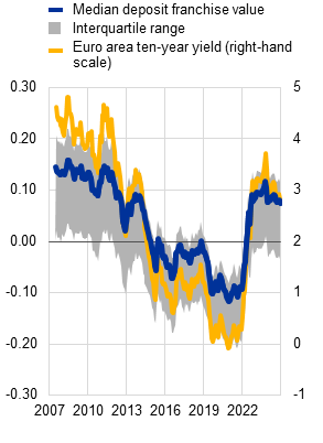 a) Deposit franchise value distribution across banks and euro area long-term interest rate