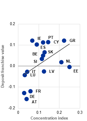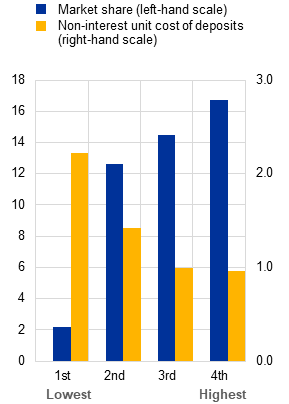 Higher market concentration, market power and cost efficiency are associated with higher deposit franchise values. Banks in countries with more concentrated banking sectors (Greece and Cyprus) tend to have higher deposit franchise values than those in less concentrated markets (Germany, France and Austria) (Chart A, panel b). Higher market concentration is often associated with a lower pass-through of interest rate changes to deposit rates[4] which is linked to the prevailing level of competition for deposits[5]. The relationship is also visible at the individual bank level, as banks with larger market shares, and hence greater market power, have higher deposit franchise values (Chart A, panel c). Another factor that contributes to the differences in banks’ deposit franchise values is cost efficiency. For example, banks with lower unit operating expenses require a lower deposit spread income to achieve a positive deposit franchise value.